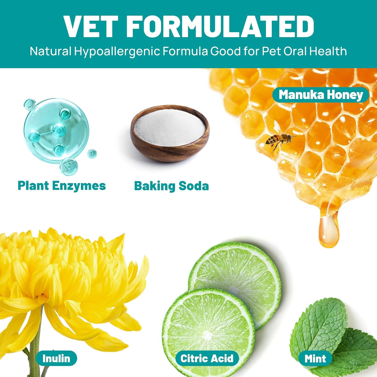 The powder mixes with saliva and activates natural enzymes that help break down plaque and tartar, while also fighting the bacteria that cause bad breath